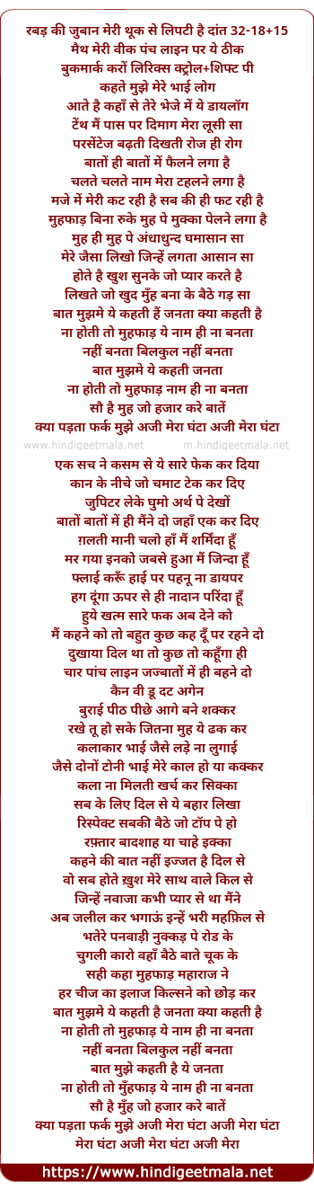 Lyrics of Aji Mera Ghanta - रबड़ की जुबान मेरी थूक से लिपटी है दांत 32-18+15