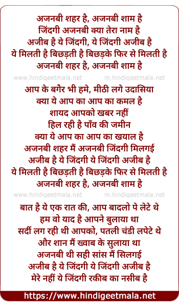 Lyrics of Ajnabi Shehar Hai, Ajnabee Sham Hai - अजनबी शहर है, अजनबी शाम है