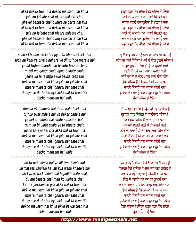 Lyrics of Aka Baka Tin Teela - अक्का बक्का तिन तीला