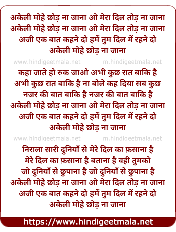 Lyrics of Akeli Mohe Chhod Na Jana O Mera Dil Tod Na Jana - अकेली मोहे छोड़ ना जाना ओ मेरा दिल तोड़ ना जाना