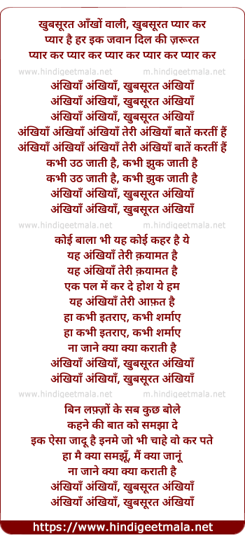 Lyrics of Akhiya Akhiya Khubsurat Akhiya - अंखियाँ अंखियाँ खुबसूरत अंखियाँ