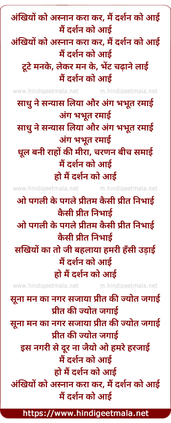 Lyrics of Akhiyon Ko Asnaan Kara Ke - अंखियों को अस्नान करा के