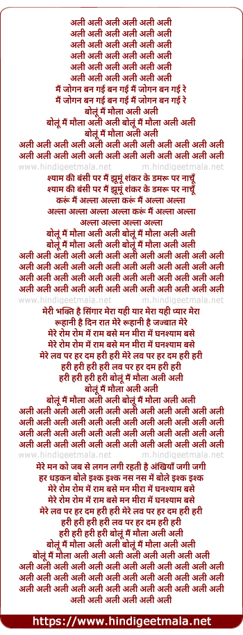 Lyrics of Ali O Ali - अली अली अली अली अली अली