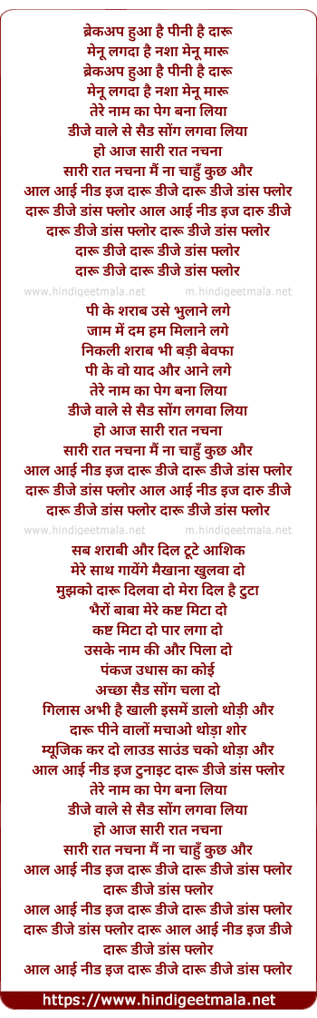 Lyrics of All I Need - ब्रेकअप हुआ है पीनी है दारू