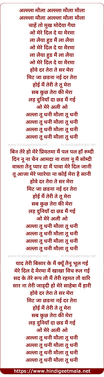Lyrics of Allaah - अल्ल्ला मौला अल्ल्ला मौला मौला