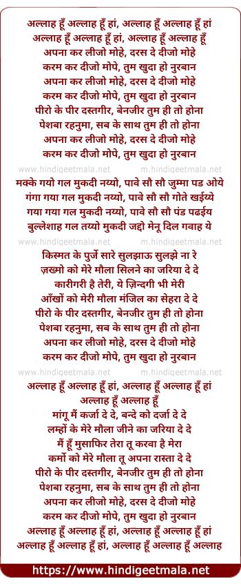 Lyrics of Allah Hu Allah - अल्लाह हूँ अल्लाह