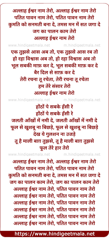 Lyrics of Allah Ishwar Naam Tero - अल्लाह ईश्वर नाम तेरो