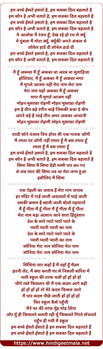 Lyrics of Hum Bache Haste Hasate Hai - हम बच्चे हँसते हसाते है