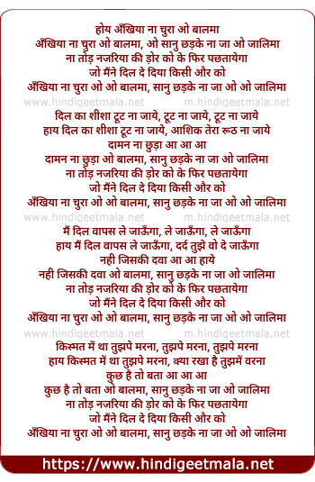 Lyrics of Ankhiya Na Chura O O Baalama - अँखिया ना चुरा ओ ओ बालमा