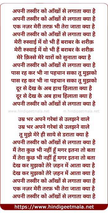 Lyrics of Apanee Tasvir Ko Aankho Se Lagata Kya Hai - अपनी तस्वीर को आँखों से लगाता क्या है