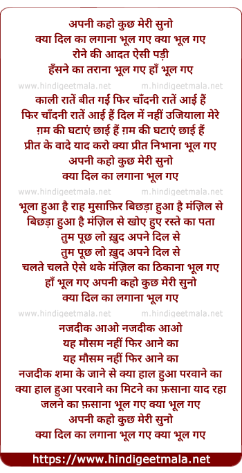 Lyrics of Apani Kaho Kuchh Meri Suno, Kyaa Dil Kaa Lagaanaa Bhul Gae - अपनी कहो कुछ मेरी सुनो, क्या दिल का लगाना भूल गये