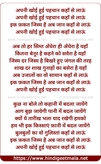 Lyrics of Apani Khoyi Huyi Pehchaan Kahaan Se Laau - अपनी खोई हुई पहचान कहाँ से लाऊं