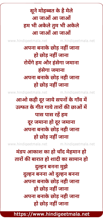 Lyrics of Apna Bana Ke Chhod Nahi Jana - अपना बना के छोड़ नहीं जाना
