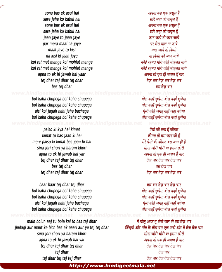 Lyrics of Apna Bas Ek Asul Hai Sare Jaha Ko Kabul Hai (Tez Dhaar) - अपना बस एक असूल हैं