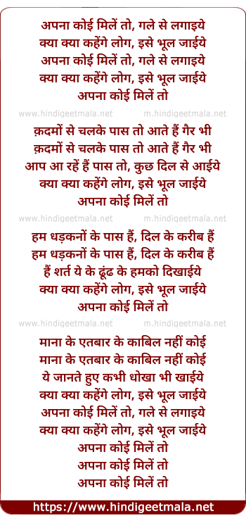 Lyrics of Apna Koi Mile To Gale Se Lagaiye - अपना कोई मिलें तो, गले से लगाइये