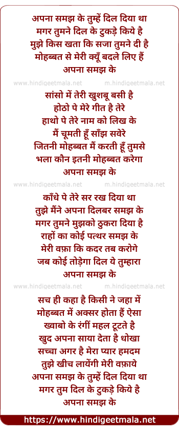 Lyrics of Apna Samaj Ke Tumhen Dil Diya Tha - अपना समझ के तुम्हें दिल दिया था