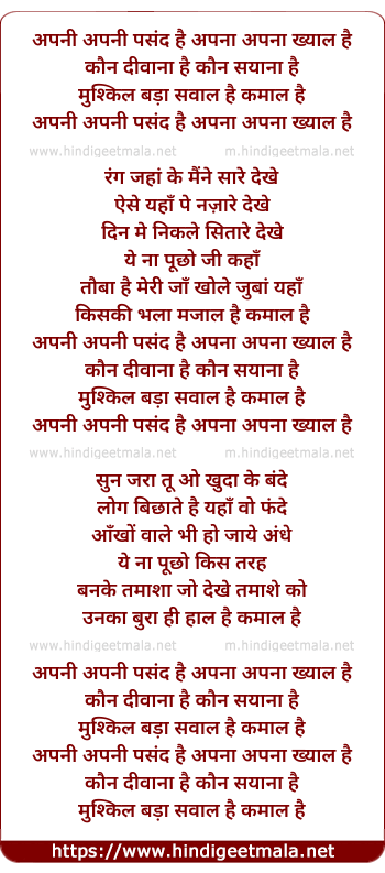 Lyrics of Apni Apni Pasand Hai - अपनी अपनी पसंद है
