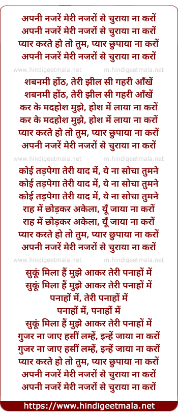 Lyrics of Apni Nazrein Churaya Na Karo - अपनी नजरें मेरी नजरों से चुराया ना करों