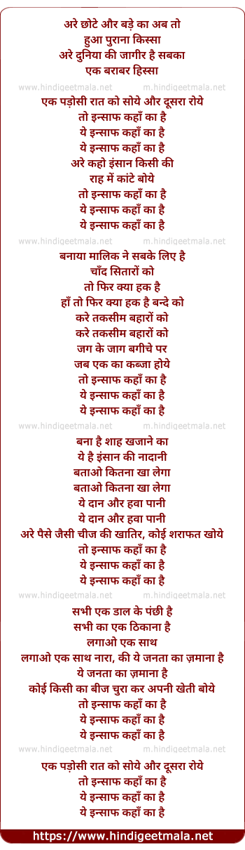 Lyrics of Are Chhote Aur Bade Kaa, Insaaf Kahaan Kaa Hai - अरे छोटे और बड़े का, इन्साफ कहाँ का है