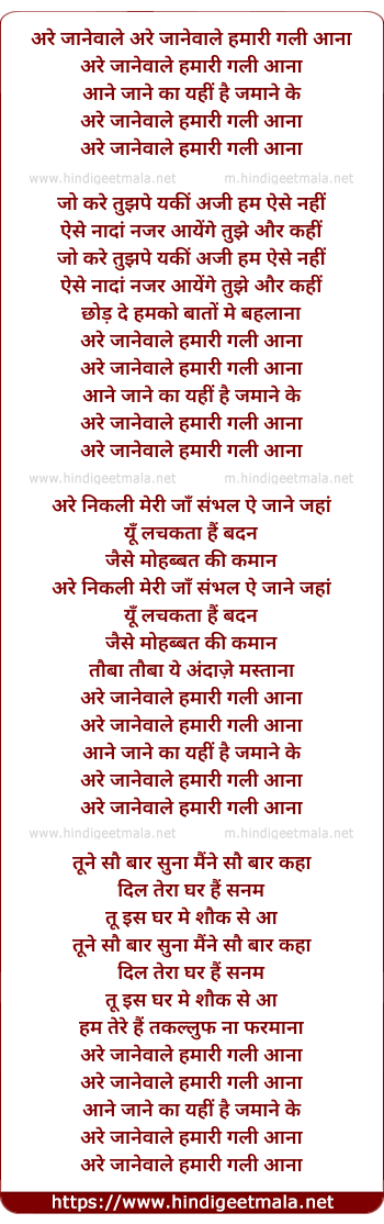 Lyrics of Are Janewale Hamari Gali Aana - अरे जानेवाले हमारी गली आना