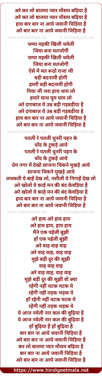 Lyrics of Are Kar Lo Balma Pyar Mausam - अरे कर लो बालमा प्यार मौसम