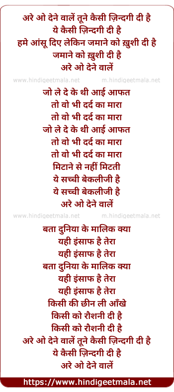 Lyrics of Are O Dene Wale Tune Kaisi Zindagi - अरे ओ देने वालें तूने कैसी ज़िन्दगी