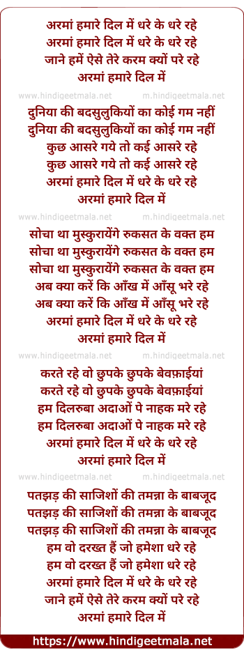 Lyrics of Armaan Hamare Dil Me - अरमां हमारे दिल में धरे के धरे रहे