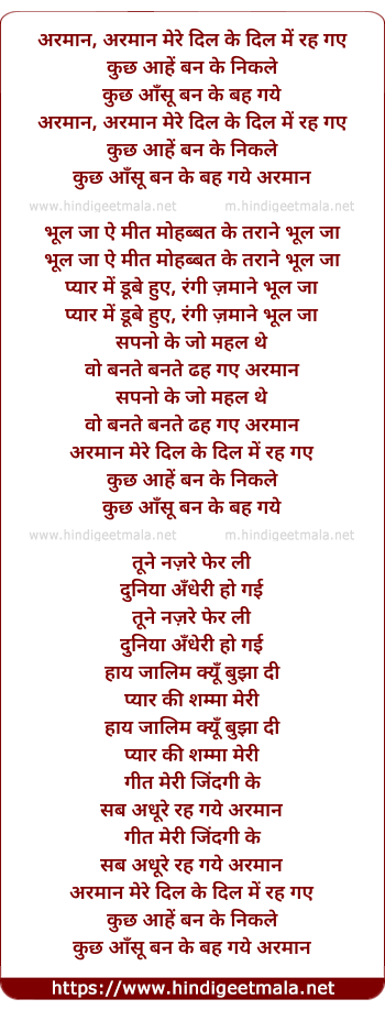 Lyrics of Arman Mere Dil Ke Dil Me Rah Gaye - अरमान मेरे दिल के दिल में रह गये