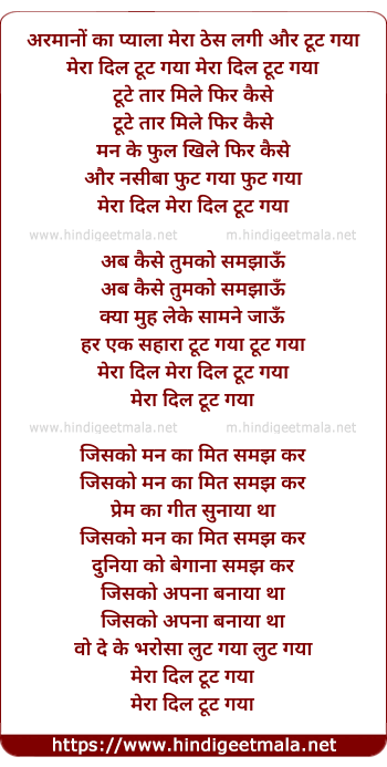 Lyrics of Armano Ka Pyala Mera Thes Lagi - अरमानों का प्याला मेरा ठेस लगी और टूट गया