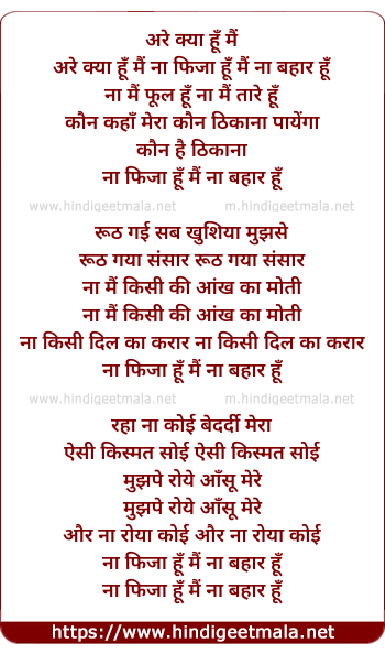 Lyrics of Arre Kya Hun Mai Na Fiza Hu Mai Na Bahar Hu - अरे क्या हूँ मैं ना फिजा हूँ मैं ना बहार हूँ