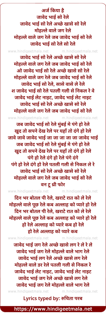Lyrics of Arz Kiyaa Hai Jaaved Bhaai So Raele - अर्ज किया है जावेद भाई सो रेले