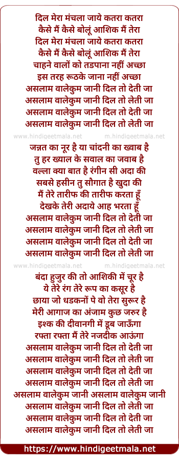 Lyrics of Asalam Walekum Jani Dil Toh Detee Ja - दिल मेरा मंचला जाये कतरा कतरा