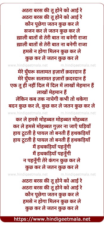 Lyrics of Atharaa Baras Ki Tu Hone Ko Aai Re - अठरा बरस की तू होने को आई रे