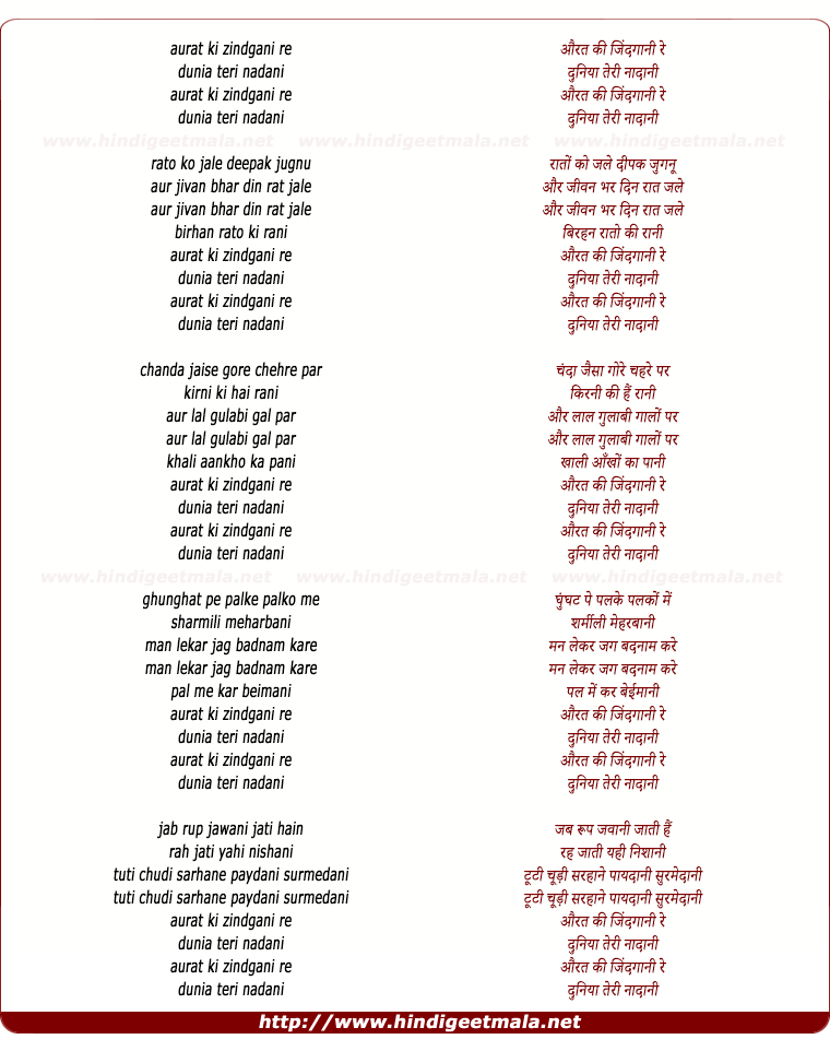 Lyrics of Aurat Ki Zindgani Re Duniya Teri Nadani - औरत की जिंदगानी रे दुनिया तेरी नादानी