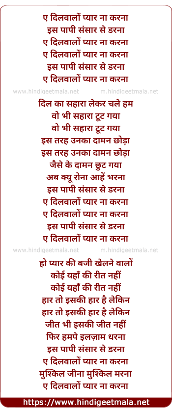 Lyrics of Aye Dilwalo Pyar Na Karna - ए दिलवालों प्यार ना करना