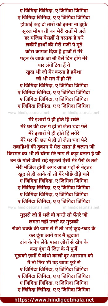 Lyrics of Ae Jigidaa Jigida - ए जिगिदा जिगिदा