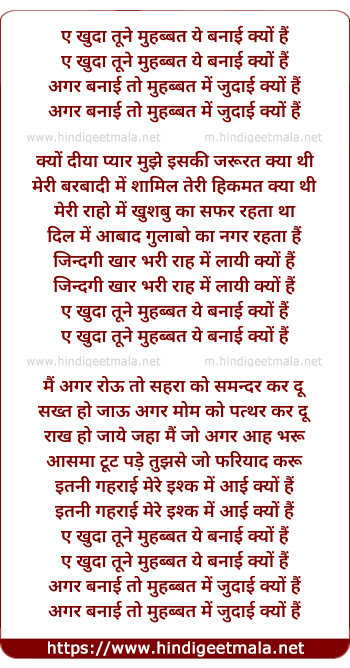 Lyrics of Aye Khuda Tune Mohabbat - ऐ खुदा तूने मुहब्बत