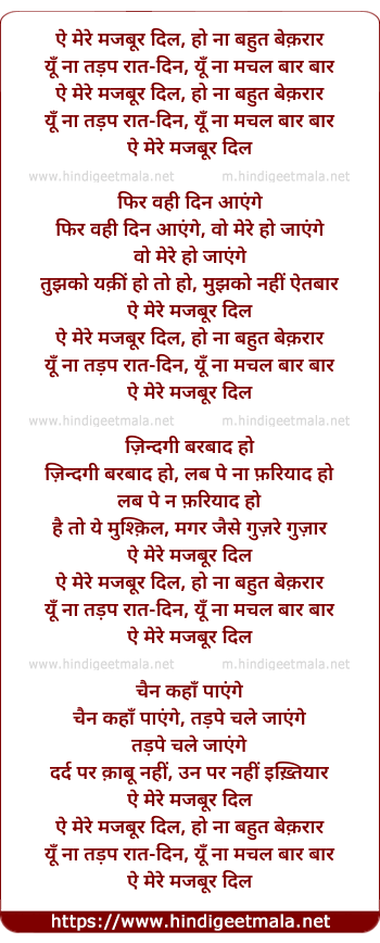 Lyrics of Ae Mere Majbur Dil, Ho Na Bahut Bekraar - ऐ मेरे मजबूर दिल, हो ना बहुत बेक़रार