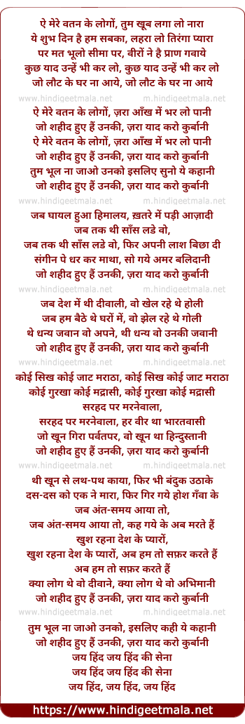 Lyrics of Ae Mere Watan Ke Logo, Zara Aankh Me Bharlo Paani - ऐ मेरे वतन के लोगो, ज़रा आँख में भर लो पानी