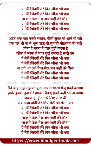 Lyrics of Aye Meri Jindagi Tere Bin Jina Bhi Kya - ऐ मेरी जिंदगी तेरे बिन जीना भी क्या