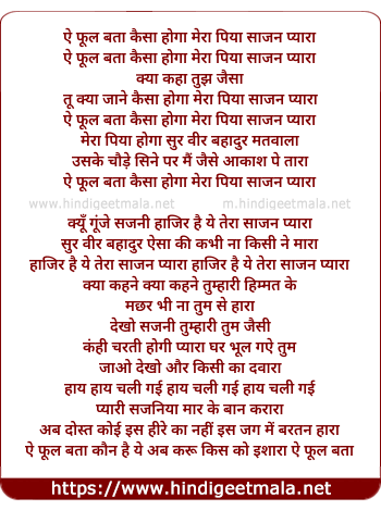 Lyrics of Aye Phul Bata - ऐ फूल बता कैसा होगा मेरा पिया साजन प्यारा
