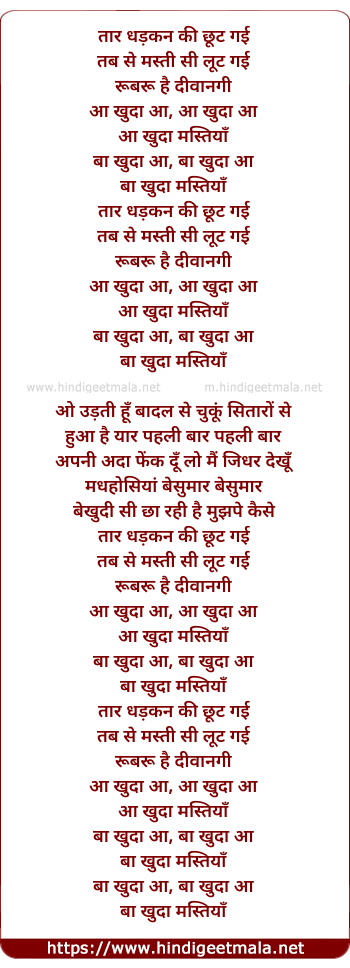 Lyrics of Ba Khuda Ba Khuda Mastiya - तार धड़कन की छूट गई