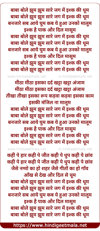 baba bole jhum jhum sare jag mein ishq ki dhum