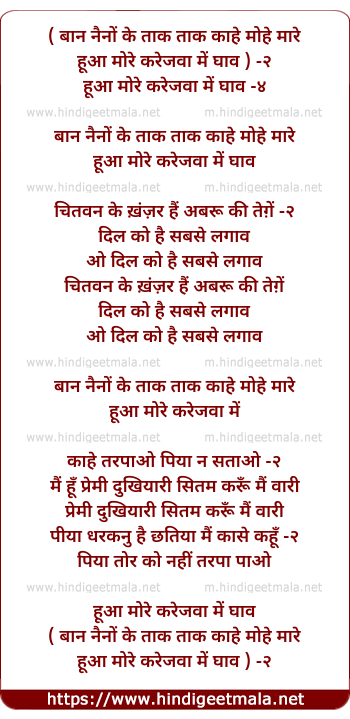 Lyrics of Baan Nainon Ke Taak Taak Kaahe Mohe Maare - ( बान नैनों के ताक ताक काहे मोहे मारे