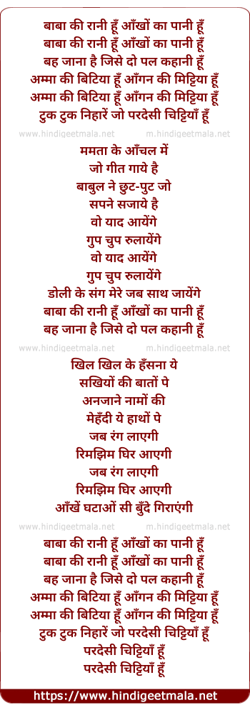 Lyrics of Baba Ki Rani Hoon Aankhon Ka Pani Hoon - बाबा की रानी हूँ आँखों का पानी हूँ