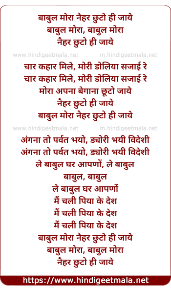Lyrics of Babul Mora Naihar Chhooto Jaaye (Ii) - बाबुल मोरा नैहर छुटो ही जाये