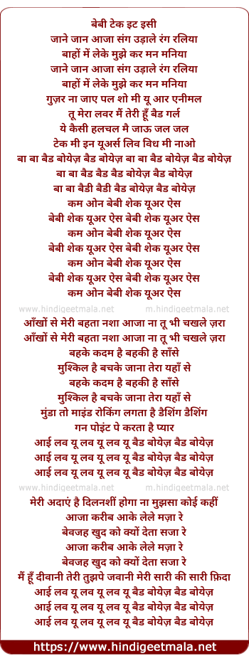 Lyrics of Bad Boys, Jane Jaan Aaja Sang Udhale Rang Raliya - बैड बोयेज़, जाने जान आजा संग उड़ाले रंग रलिया