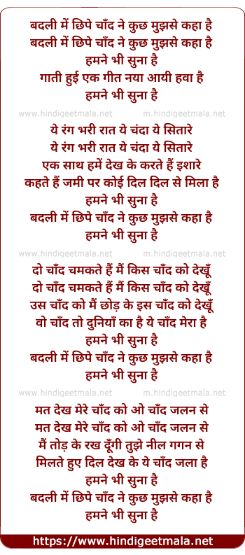 Lyrics of Badali Me Chhipe Chand Ne Kuch Mujhse Kaha Hai - बदली में छिपे चाँद ने कुछ मुझसे कहा है