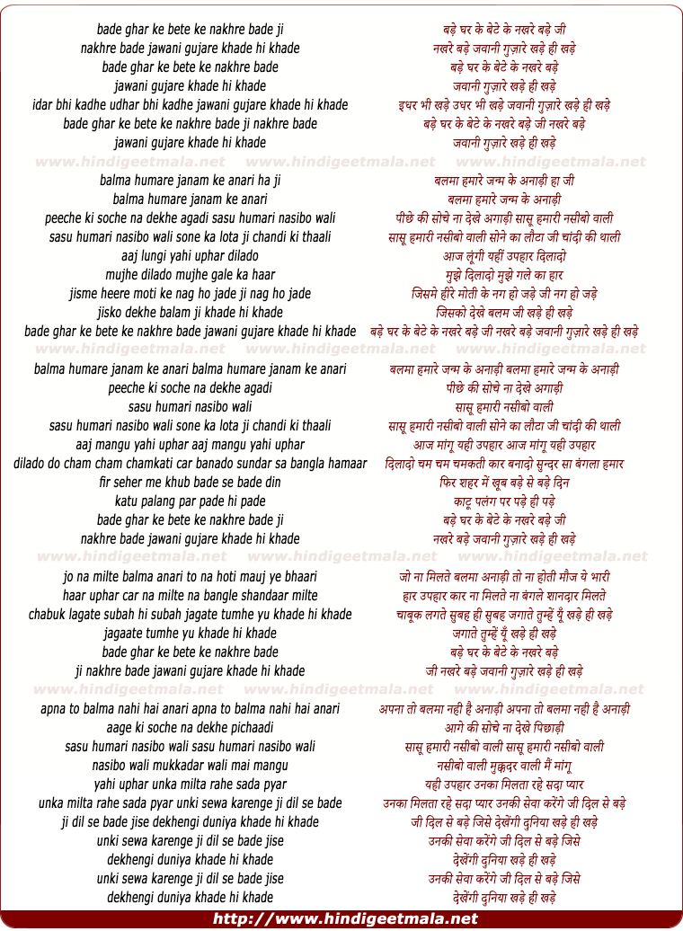 Lyrics of Bade Ghar Ke Bete Ke Nakhre Bade - बड़े घर के बेटे के नखरे बड़े
