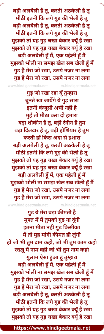 Lyrics of Badi Albeli Hai Tu, Karti Athkeli Hai Tu - बड़ी अलबेली है तू, करती अठकेली है तू